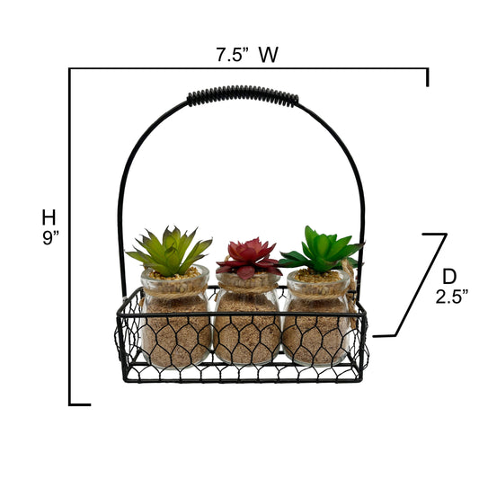 3pcs Succulents in Glass Jar W/Metal Basket Indoor Spring Summer Faux Plant