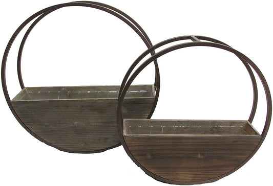 Set of 2 Round Wood Flower Planter Pots w Metal framing Wall Hanging Planters