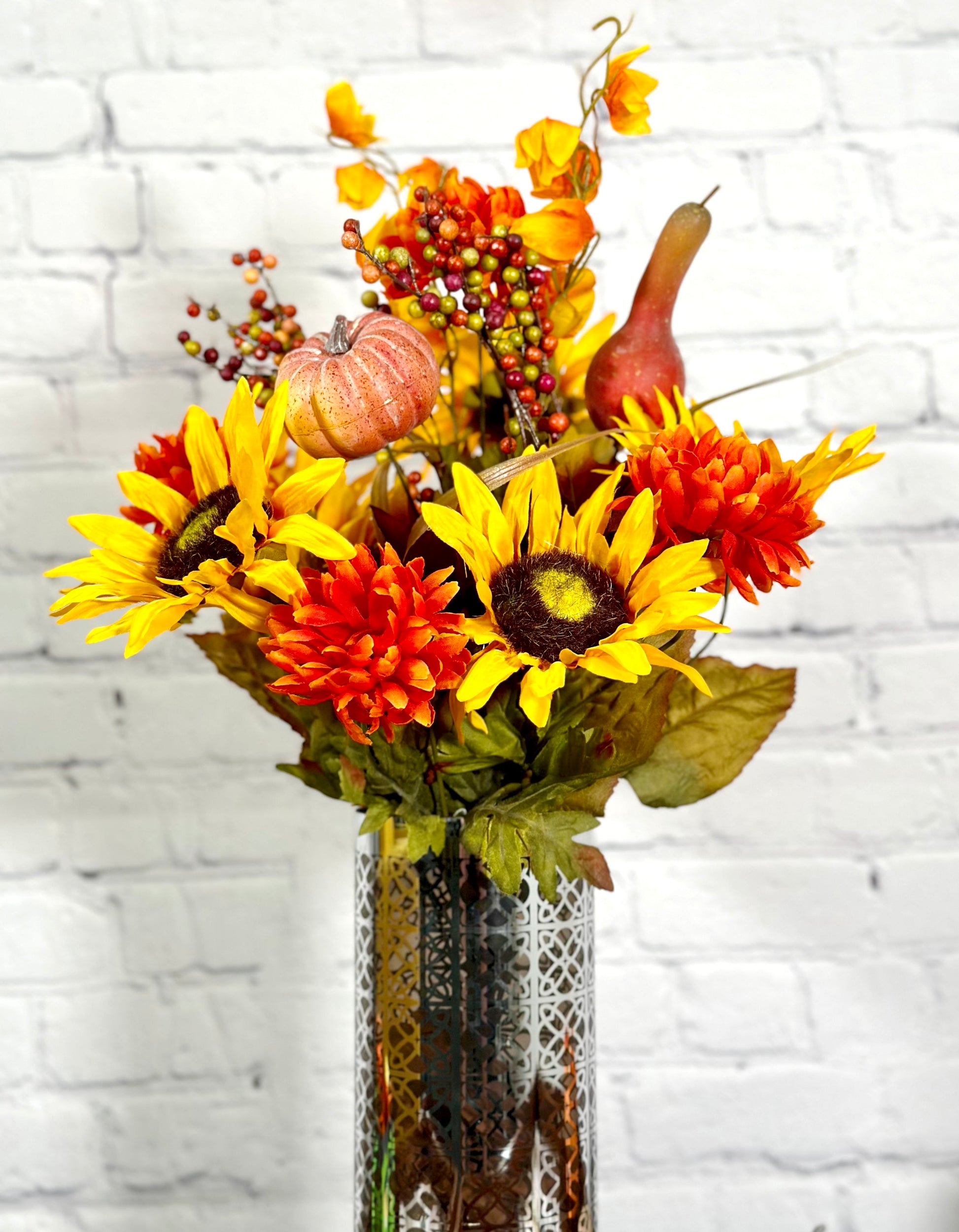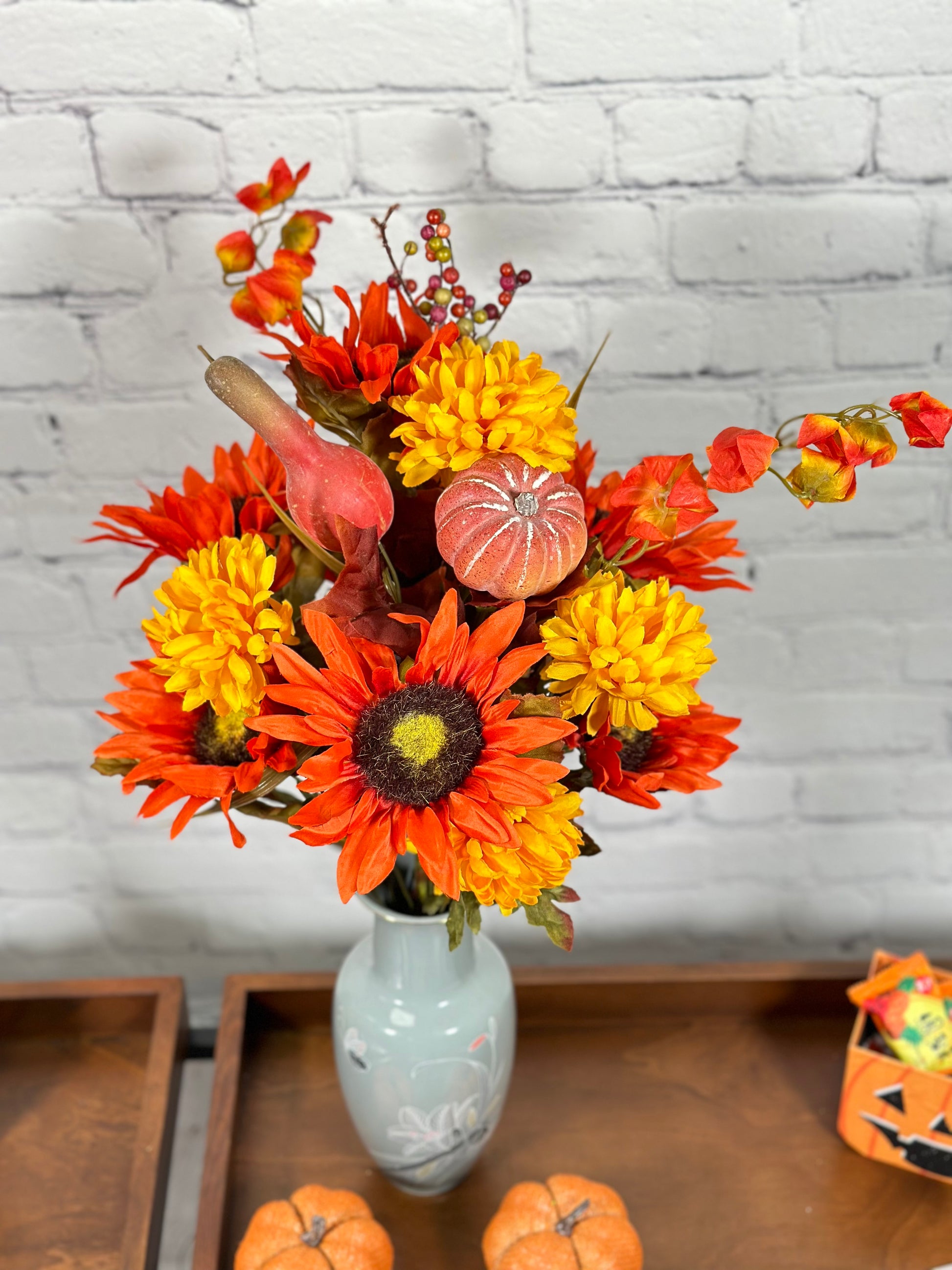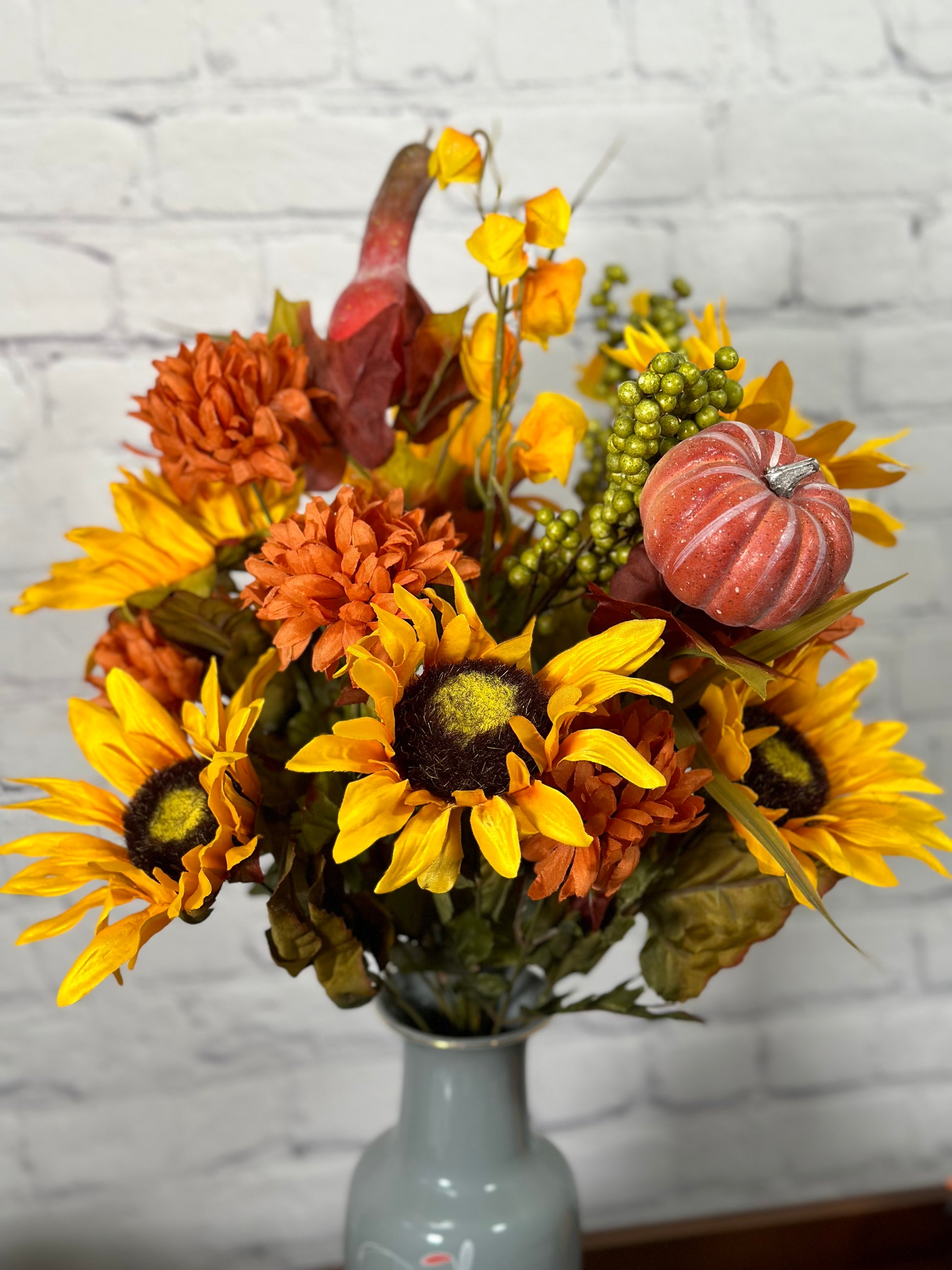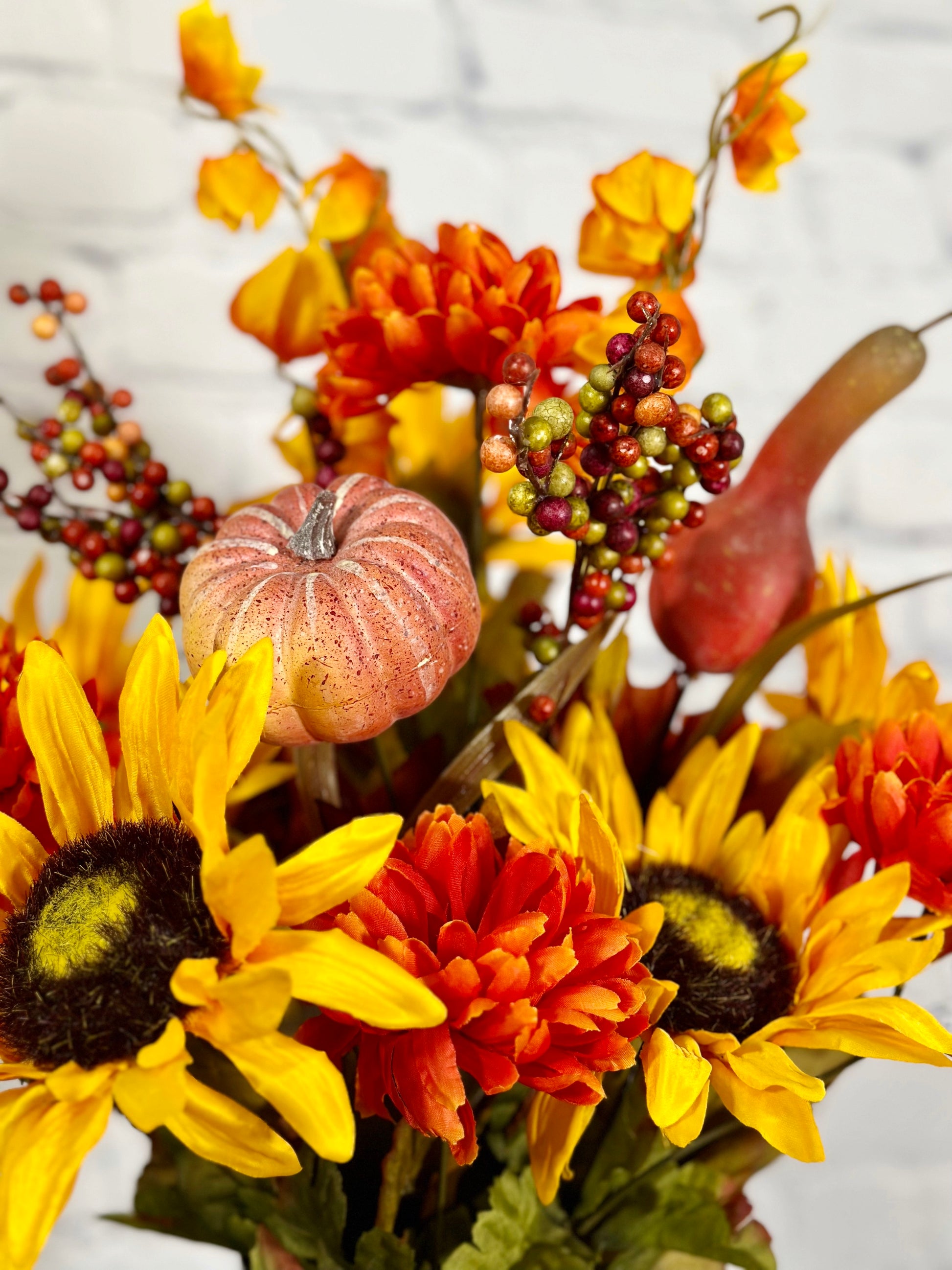 - [OCCASION] This fake fall flowers pumpkin is great fall decor outdoor porch, weddings, centerpiece decorations, fall-themed parties, Fall floral arrangements, DIY projects, fall centerpieces arrangements, or as a gift.