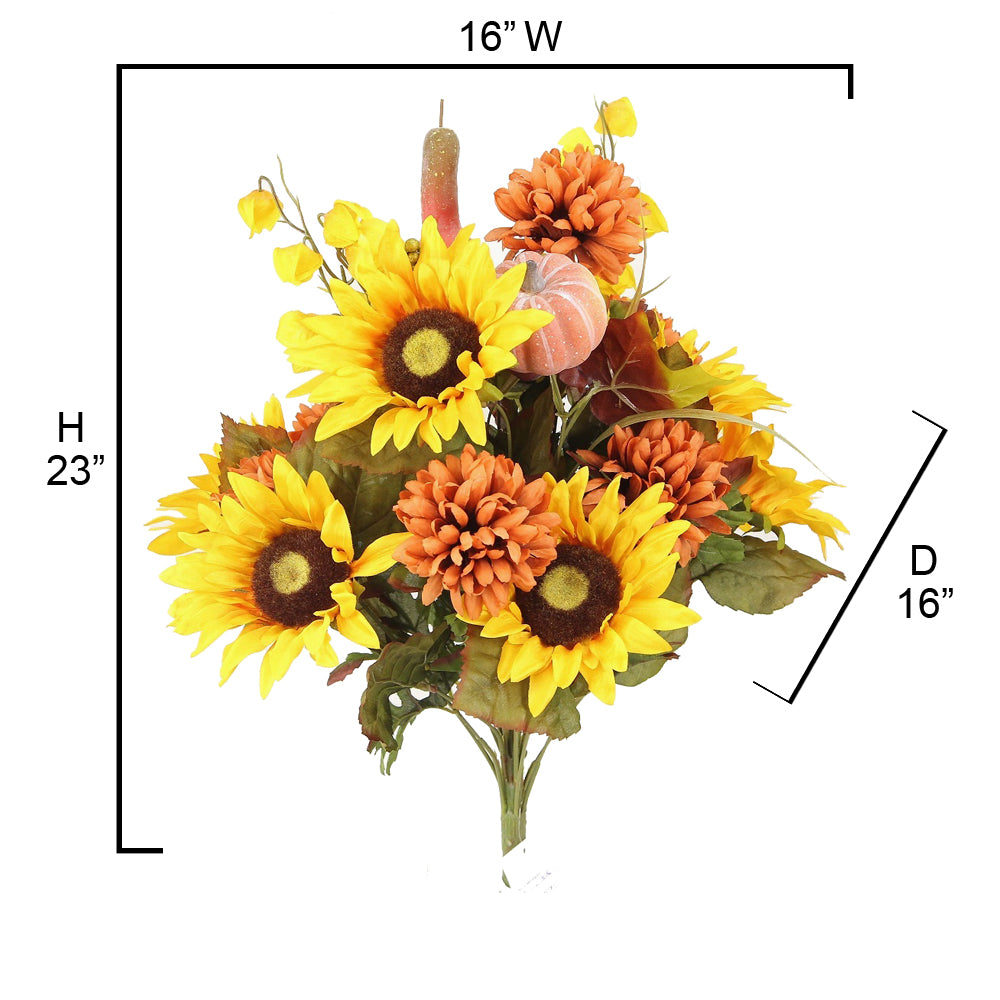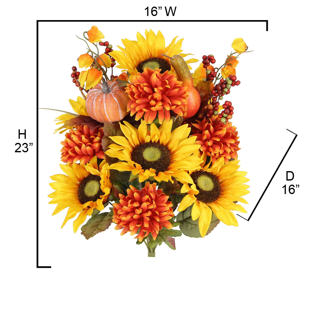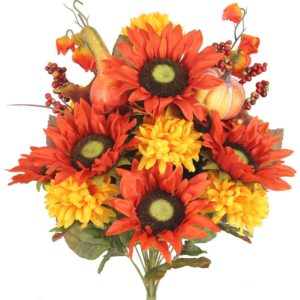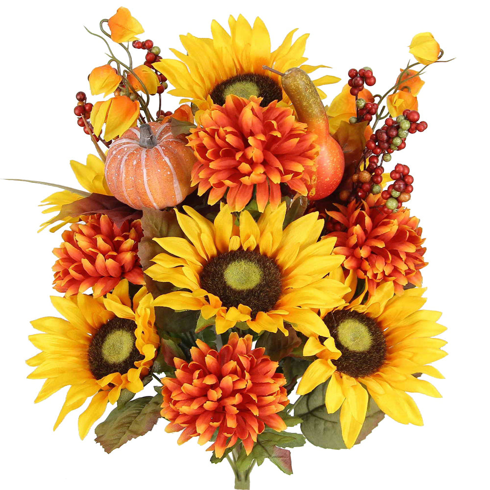 - [FEATURE] This mums artificial flowers arrangement contains faux mums Sunflower Zinna Mixed bush and is ready to use in a vase. No assembly is required. This artificial fall flowers are realistic full-looking, easy to maintain, neat, and hassle-free.