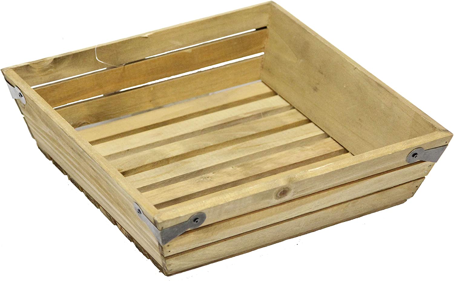Natural wood small shallow square gift tray crate with metal corner design. Great for indoor and outdoor decorating. Perfect to display your favorite flowers, plants or wine! Dimensions are based on the image shown. Accessories shown are for illustration purposes only and are not included with the product. Actual color/finish may vary slightly from screen display. Accessories shown are for illustration purposes only and are not included with the product. Inside Measurements: 10"Length x 10"Width x 3"Depth