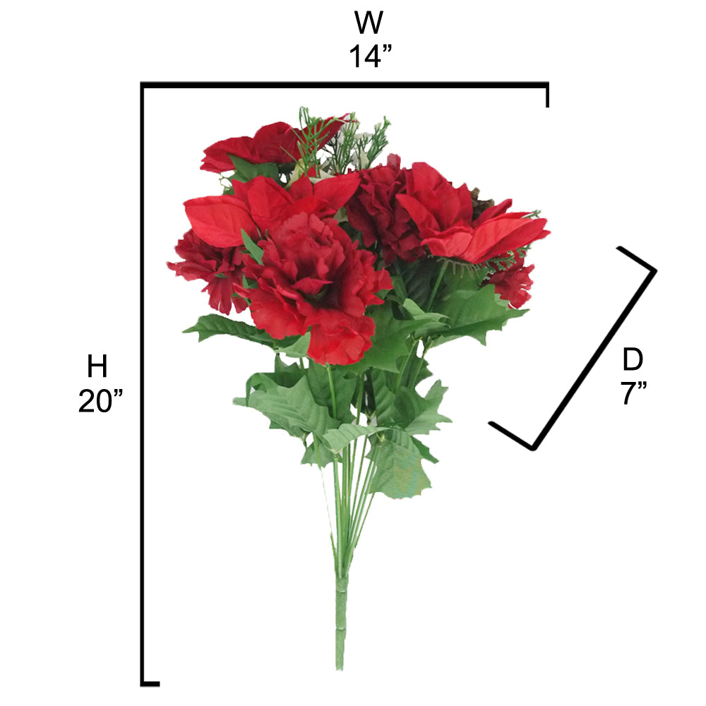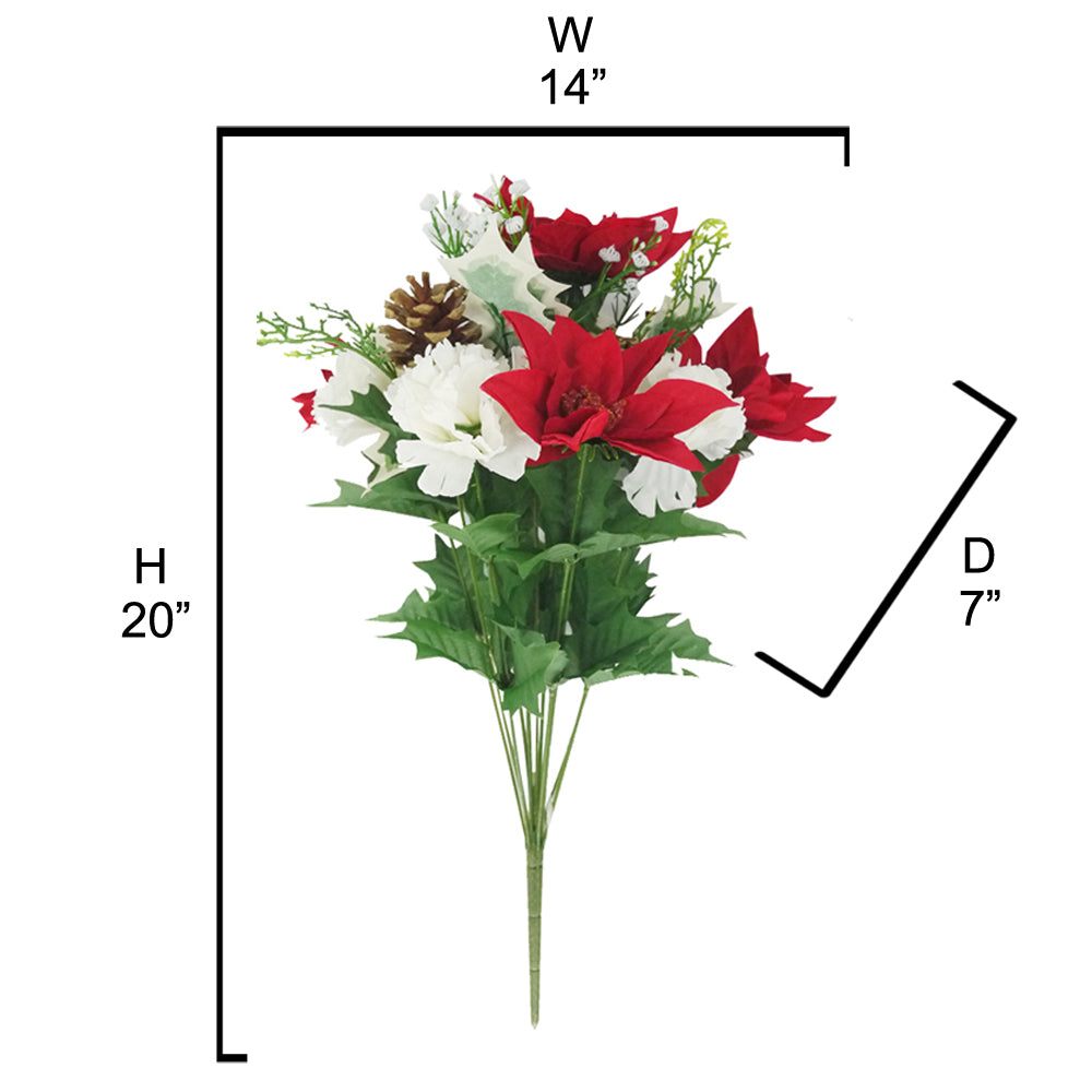 - [Size] 1 Bouquet artificial poinsettia flowers with pinecone bush. Overall size: 20"H x 17"W x 17"D. 14 branches heads of Christmas flower bouquet actual color of the product might appear darker than the images due to lighting. Recommended for indoor or covered outdoor. Not Suitable for excessive sunlight exposure.