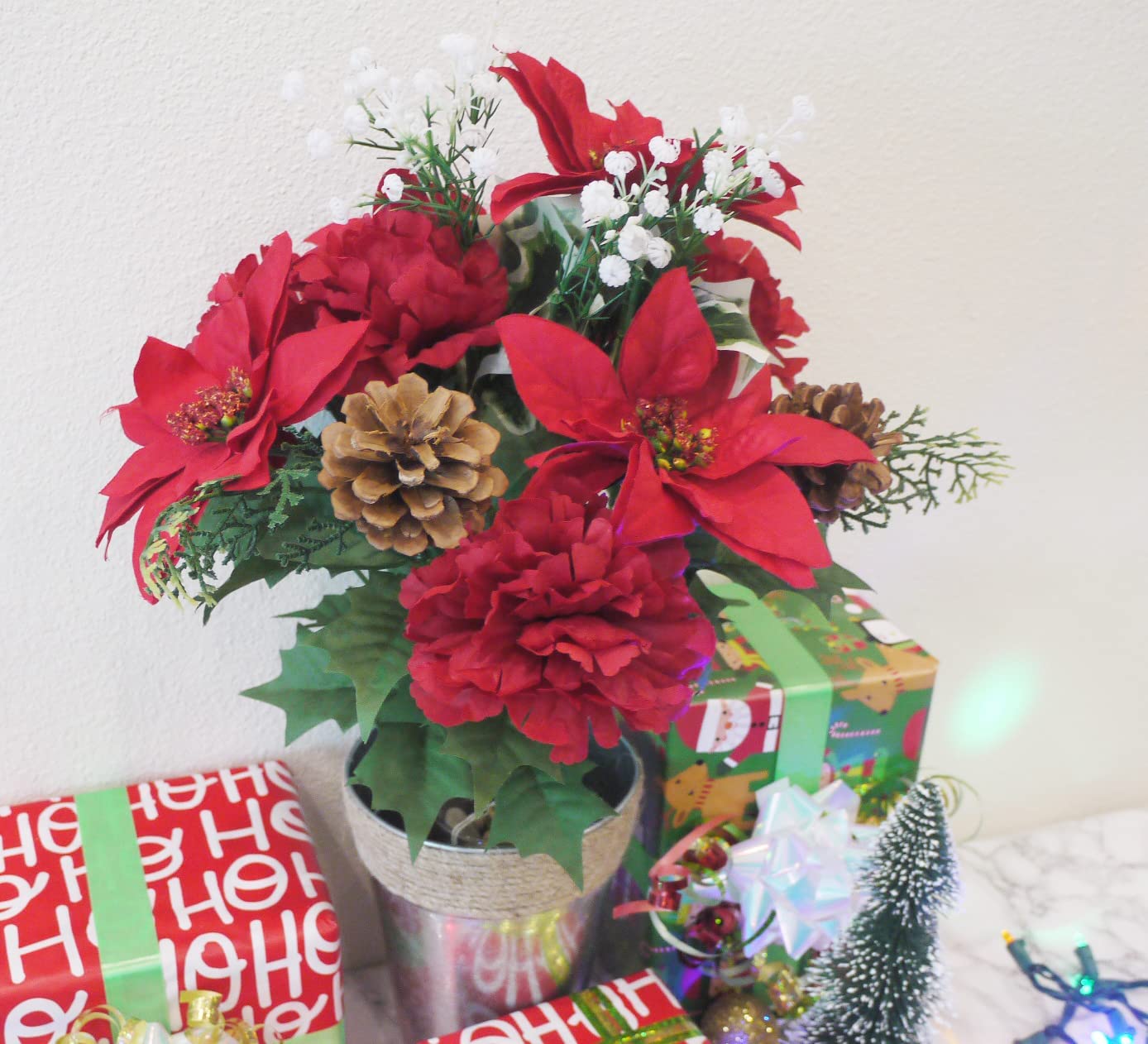 - [Stylish] Bring the joy of Christmas fake flowers that will never brown. Use artificial Christmas flowers for outdoors on your patio with your Christmas lights blinking nearby. These faux Christmas flowers will be a perfect centerpiece in your home.