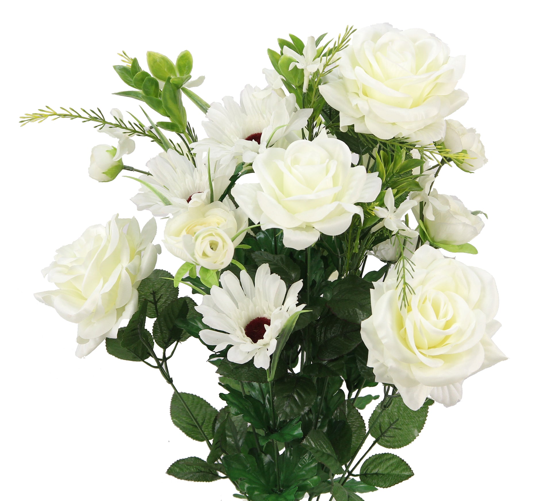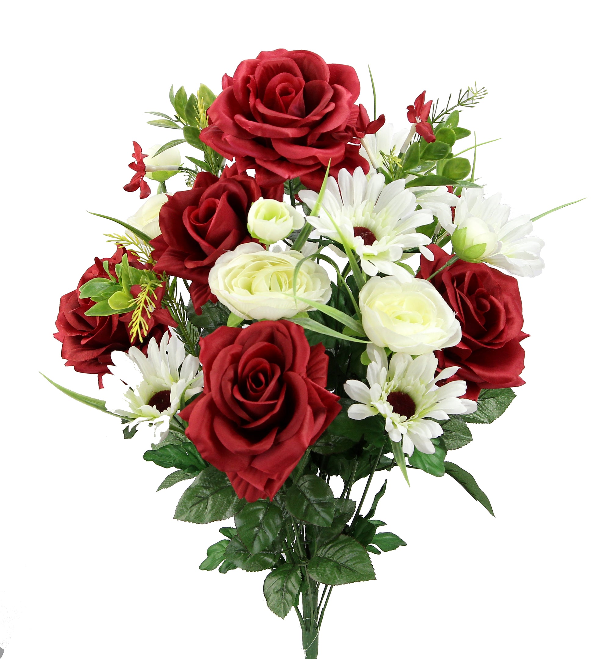 - [Size] 1 Bouquet artificial Rosa Daisy Ranunculus Mixed Bush. Overall size:7.5"D x 16"W x 25"H. 20 branches heads of Christmas flower bouquet actual color of the product might appear darker than the images due to lighting. Recommended for indoor or covered outdoor. Not Suitable for excessive sunlight exposure.