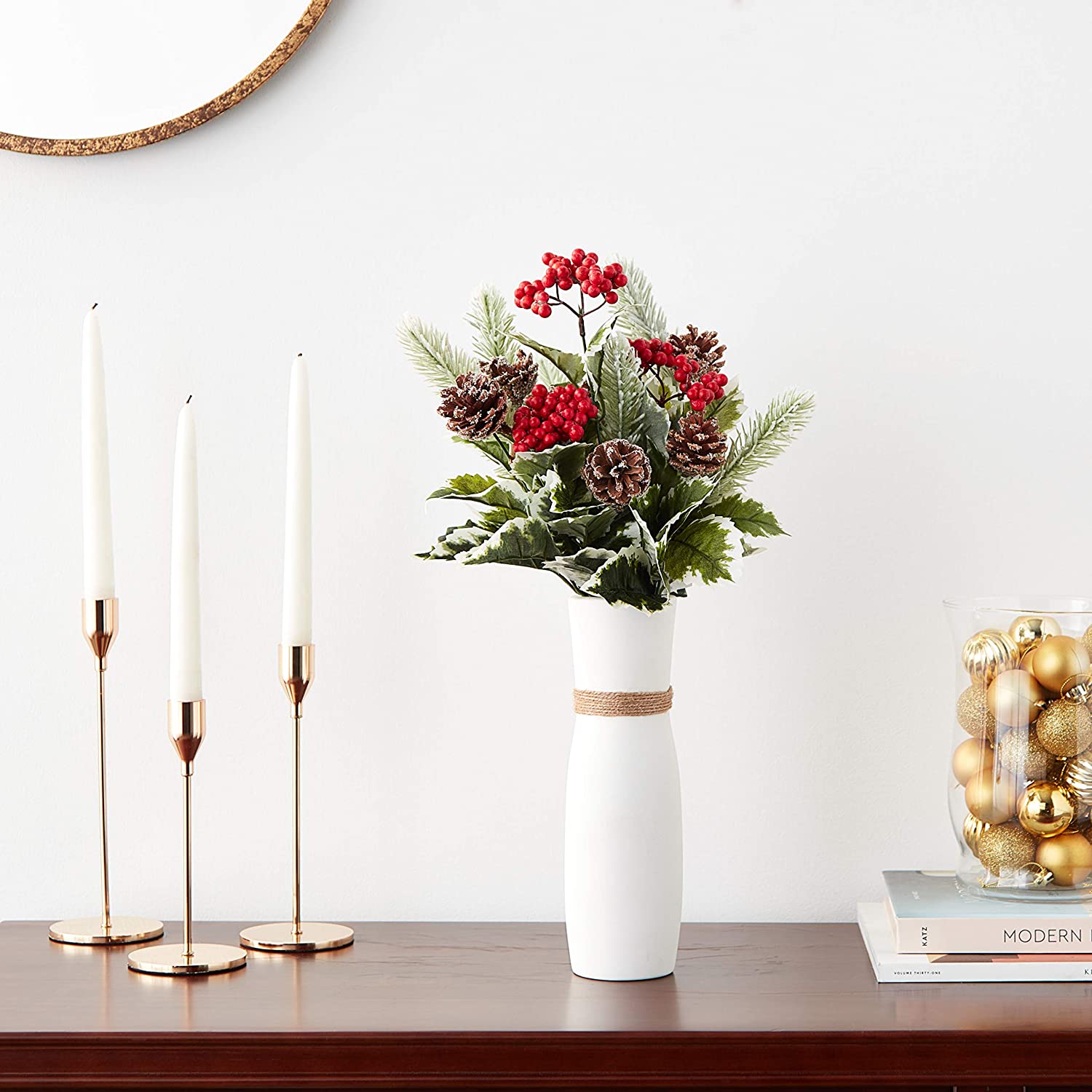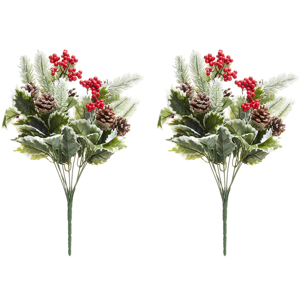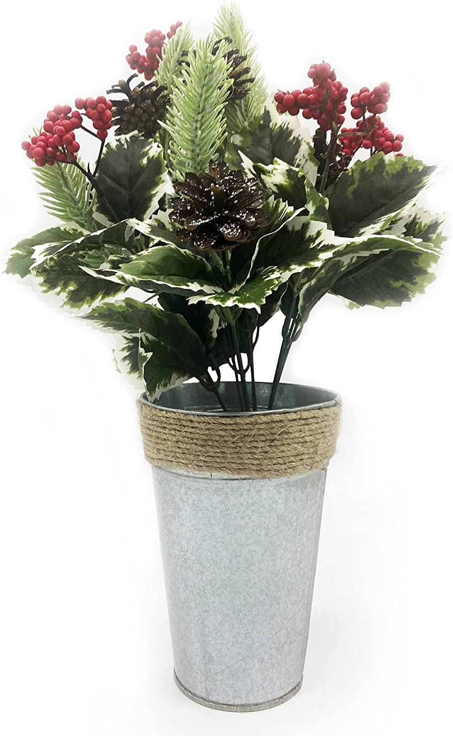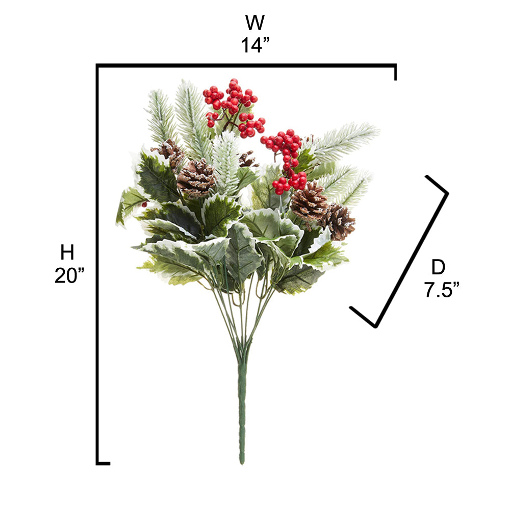 - [Size] 1 Bouquet artificial holly leaves mixture of red berries, and pinecone snow bush. Overall size: 17"H x 11"W x 7"D. Christmas holly leave berries bouquet actual color of the product might appear darker than the images due to lighting. Recommended for indoor or covered outdoor. Not Suitable for excessive sunlight exposure.
