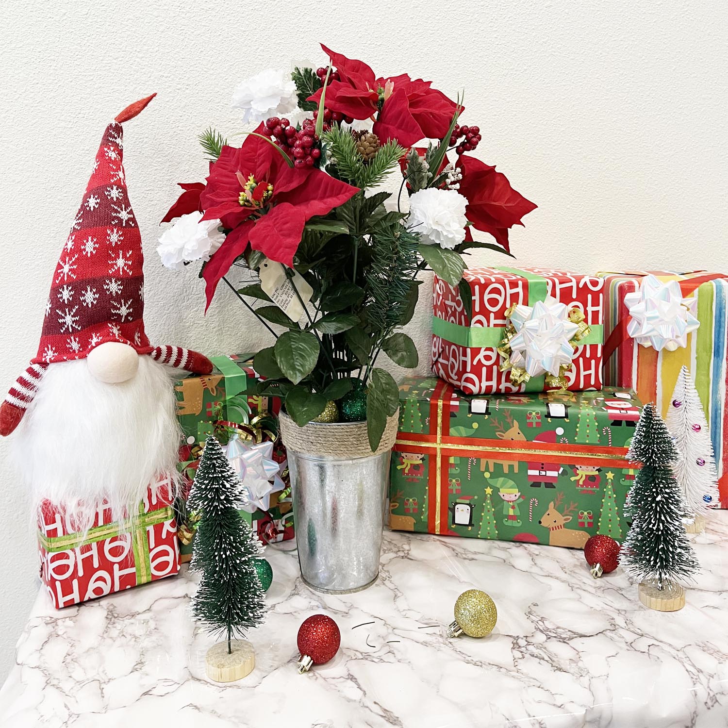 You'll love these Christmas flower arrangements for every room in your home. These flowers for Christmas make a great gift for friends or family. Decorate your loved ones cemetery space with Christmas flowers decorations. Vibrant white, red, and green is eye catching and bring memories of past holidays, and ones to come. Christmas flowers arrangements can be put out as soon as they arrive, with minimal primping. Or, use in a DIY project and make them your own. So lifelike, you may forget they're artificial and try to water them. No watering or pruning needed. Unlike the real thing, these poinsettia stems are not toxic. They're safe to be all around the home around your kids and pets. Start your checklist now: Christmas cookies, Christmas trees, holiday lights, presents, and Christmas flower decorations. Don't wait for Santa to bring you the items you adore, love yourself and get yourself an item on your wish list. Check out our store to find other products and flowers for all other occasions.